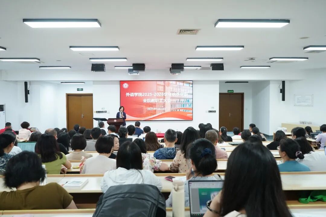 2025年9月24日,比基尼 召开2025-2026学年秋季学期全院教职工大会。大会特邀原比基尼 外语系主任黄源深教授、人文与社会科学研究院院长吕志峰教授开展主题讲座,全体教职工参加。
