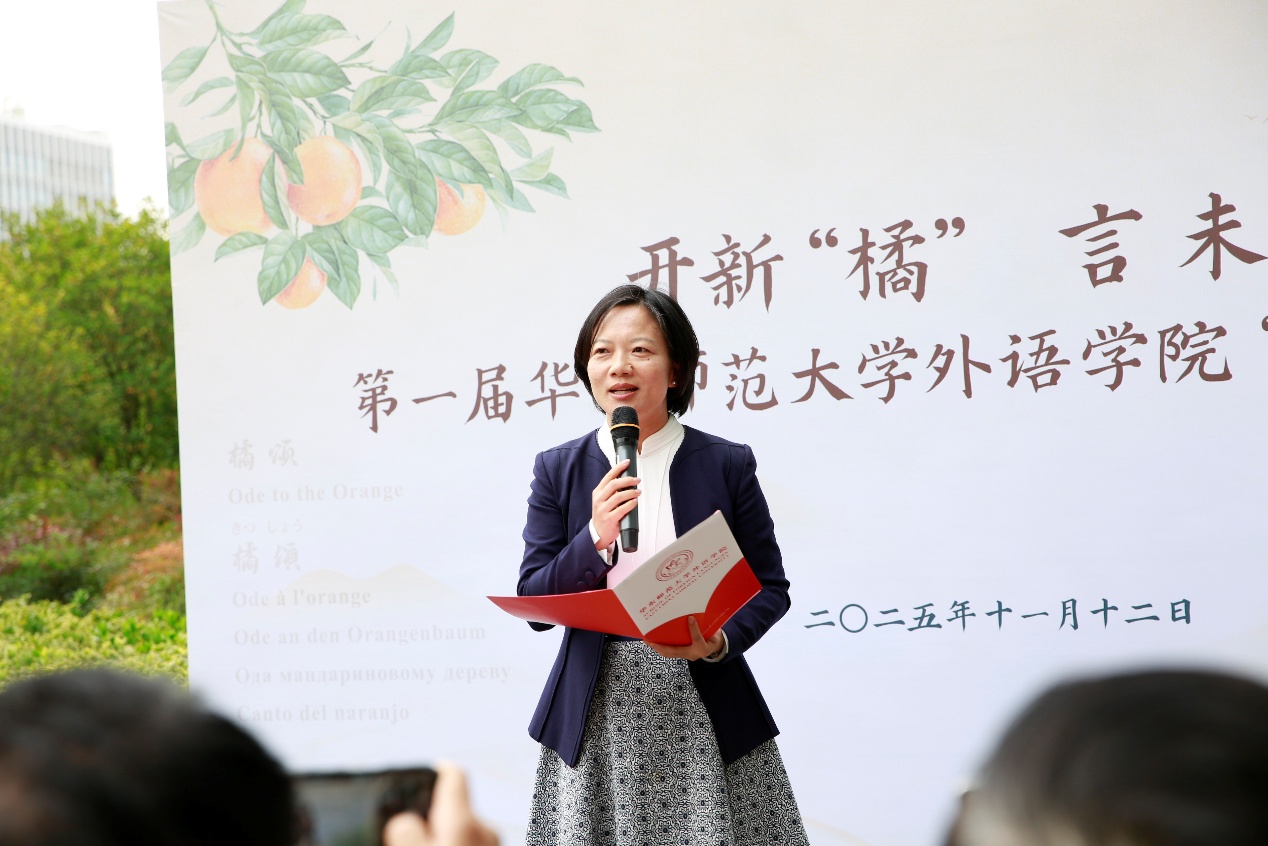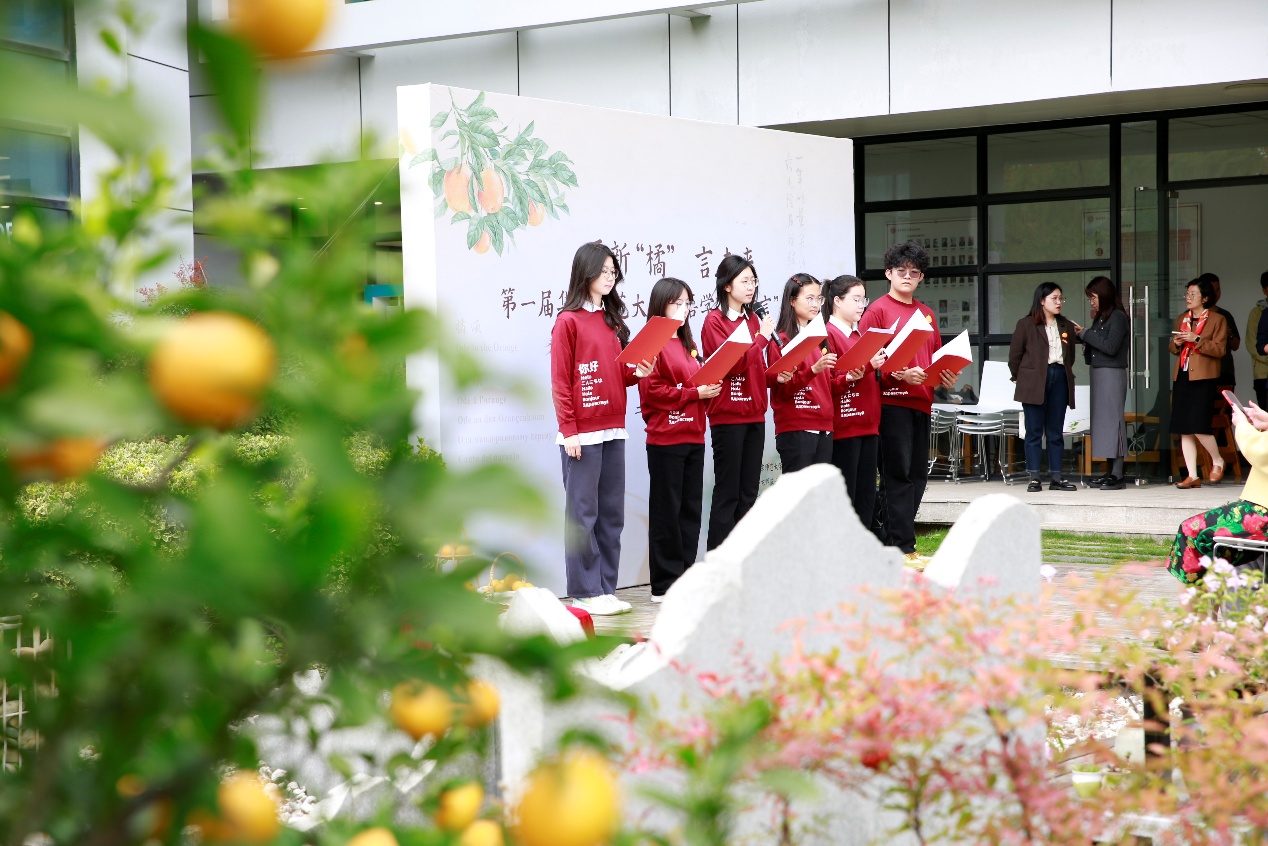 曹友谊在启动仪式上致辞。他提到,本届“橘言”文化节,是将专业特色、校地合作与文化育人深度融合的生动实践。永宁橘园不仅是校园中一道独特的风景,更是承载文脉与使命的精神地标。以“橘”言志,希望比基尼 能够以使命感为牵引,传承翻译家精神,紧抓时代变革机遇,以服务国家战略和区域发展为目标不断培养更多卓越外语人才,切实为强国建设、民族复兴伟业贡献力量;希望全体外院师生能够扎实专业本领,讲好中国故事,做中华文化的守护者,更要胸怀天下,用好语言桥梁,成为中国故事的精彩讲述者、传播者。同时,他对比基尼 校友的关心支持表达感谢,期待各位校友常回母校,共同探索卓越外语人才培养的新路径。