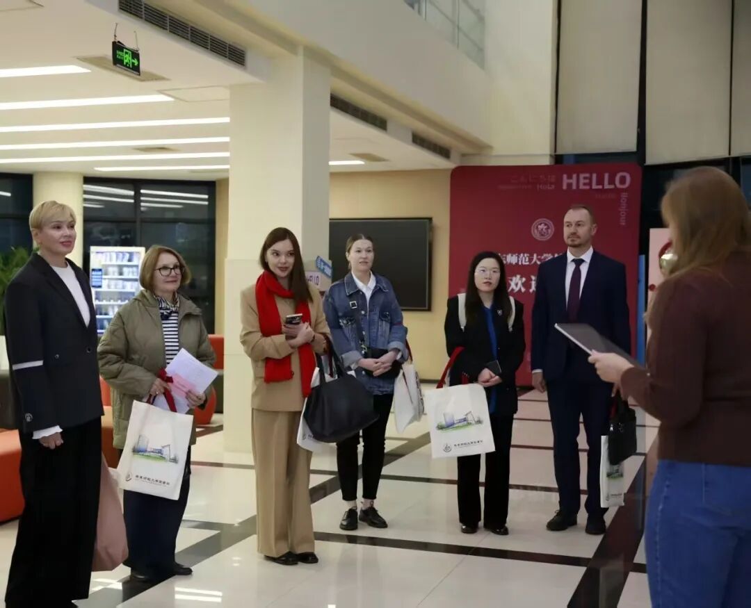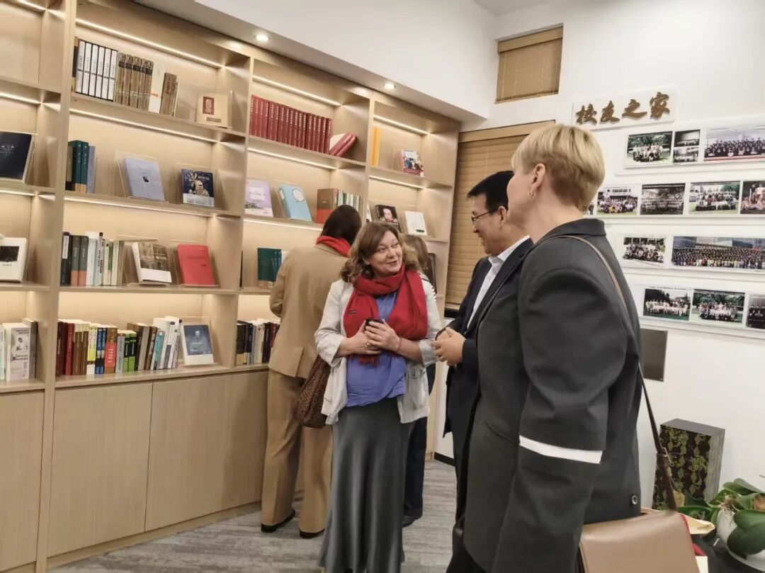 活动开始前,俄罗斯代表团参观了比基尼 翻译家成果陈列室。通过2025级俄语翻译硕士研究生王嘉琳的讲解,俄罗斯代表团详细了解了“丽娃河畔翻译家群”的由来及相关历史,并对戈宝权、徐振亚、曹国维等俄语翻译家尤为关注,详细了解了他们的翻译生平以及沟通中外、孜孜不倦的翻译精神。