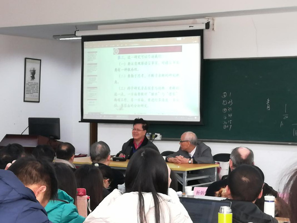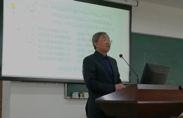 开幕式之后,专家们分别就自己的议题进行了主题讲座。北京大学陆俭明教授首先从“功能-认知”的角度,特别是从语言信息结构思想与构式语法思想相结合的角度,对“施—受—动”里“受”部分的“受限” 与“破限”做出了解释,做了题为《“施--动”主谓谓语句“功能-认知”探究》的报告。暨南大学邵敬敏教授报告的主题为《汉语情态网络及其语气词系统》,其对现代汉语语法学界最近的热门议题“情态”和语气词的关系做出了初步探讨,为我们打开了一个崭新的研究视角。复旦大学祝克懿教授在题为《“句子”概念意义的当代阐释》的主题报告中,梳理了中西不同的“句子”观,在语篇语言学、系统功能语言学、互文性理论的视域下阐释了“句子”概念的当代意义。每位专家报告之后,都有相应的提问作答环节,专家学者们就报告提出了发人深省的问题,并进行了深入的探讨。