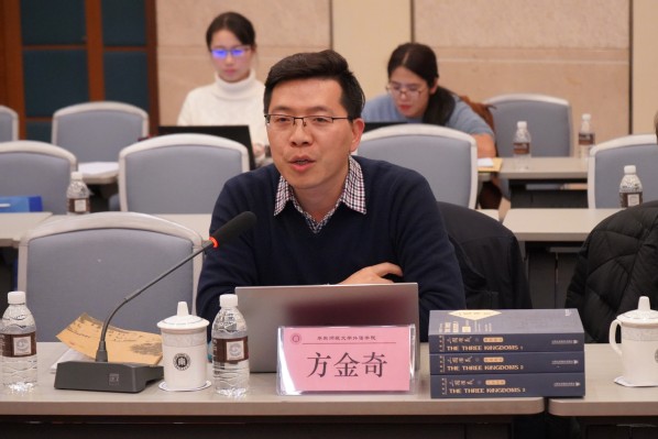 华东师大比基尼 英语系、翻译系主任陈弘教授在主持会议时,首先介绍了虞苏美先生的生平,分享了虞先生女儿发来的英文诗,回忆了自己与虞先生共事的经历,介绍了先生《三国演义》全译本的工作,称赞其匠心独具、高屋建瓴的笔势将这部“跨时代、跨民族、跨国度”的鸿篇巨著生动地重现给了广大读者,为促进汉译外事业和中国文化大踏步“走出去”的发展做出了贡献。以“今天,我们既要追思,也要传承”,拉开了座谈会的序幕。