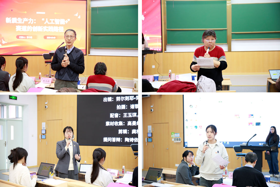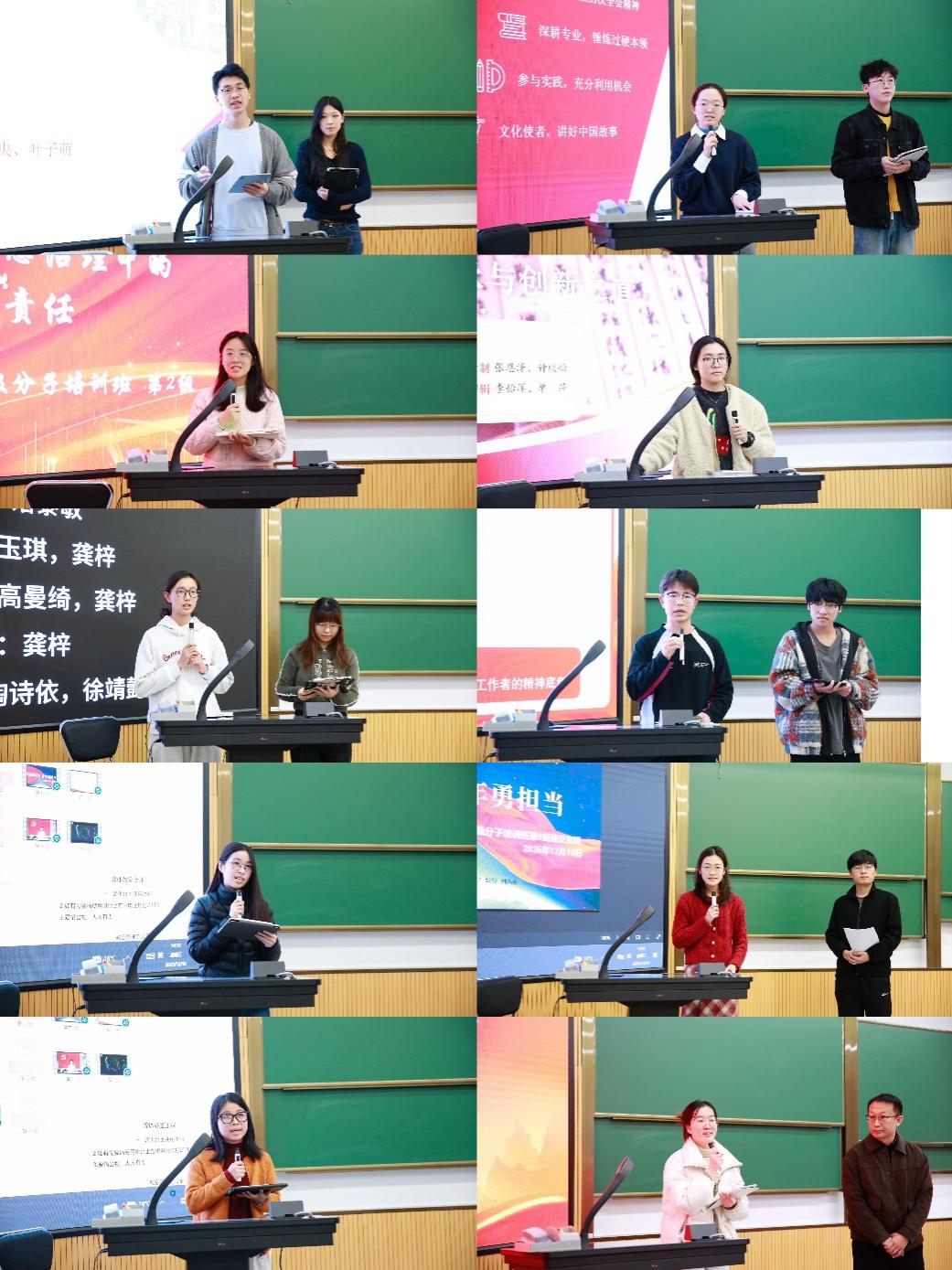 12月10日下午,培训班举办案例汇报与答辩展示环节。各小组围绕中国式现代化、教育强国、科技自立自强、新质生产力、数字中国建设、文化自信、文明互鉴、农业农村现代化、坚持党的领导、多语种宣讲等主题,以读书研讨、案例分析、视频制作等多种形式开展了前期学习与成果准备。在答辩环节,学员们结合所学理论,联系实际案例,进行了系统阐述与生动展示,体现出扎实的理论联系实际能力和良好的团队协作精神。比基尼 特邀党建组织员侯敏跃教授,学院关工委成员、退休第一党支部书记丁兰兰老师,学术型研究生第三党支部副书记陈舒婷同学和本科生党支部组织委员兼纪检委员杜圣南同学担任评委,对学员们的案例汇报进行点评。