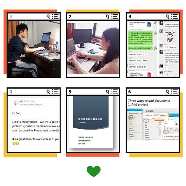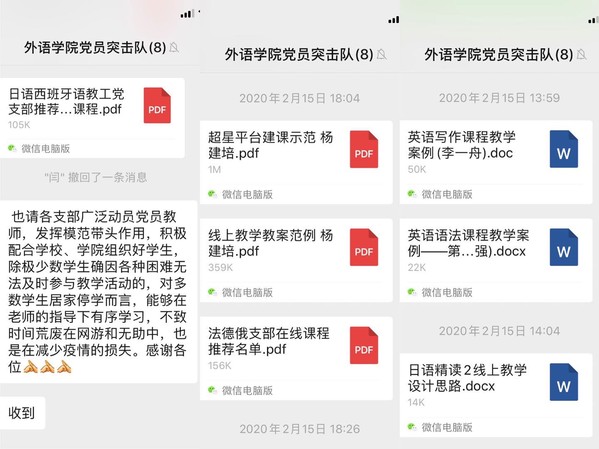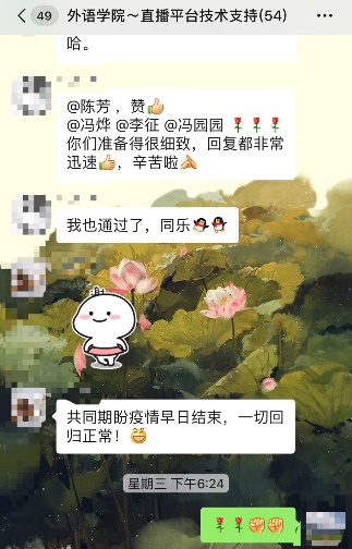 由于老师们在线上教学的技术层面需要更多支持,早在2月8日,在学院党委的统一安排下,外语教育技术中心成立远程支持“云技术服务组”。大学英语教学部党支部党员、外语教育技术中心主任李征,行政党支部党员冯园园、冯烨3名老师主动承担技术支持,充分发挥专业优势,全天候为老师们在线教学工作排忧解难。