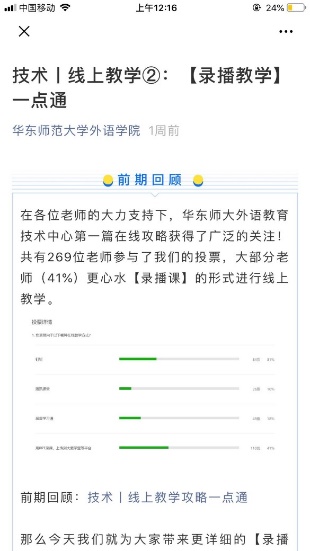 以调查研究为抓手,精准科普教学软件。“云技术服务组”对市面上现有的线上教学软件进行了详细调研,经过反复测试、研究与比对,从十余种产品中遴选出了适合外语线上教学的产品,分成直播课和录播课两类进行推荐。为了让授课教师更详细地了解在线教学的操作逻辑和软件的使用方法,技术组的三位老师精心制作了各款软件的操作视频和文字教程,通过比基尼 微信公众号整合发布。截至2月20日,微信文章累计阅读量超过7000人次,详实的解析和简易的操作流程得到了老师们的认可,除比基尼 教师外,其他院系和高校的教师都从中受益。