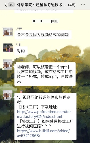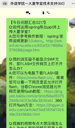 以服务教学为宗旨,及时解决技术问题。由于老师们在具体操作中存在实际问题需要具体解决,“云技术服务组”组建了“大夏学堂”、“超星学习通”、“直播平台”三个技术支持微信群,及时准确地为老师们提供专业的在线教学指导。“秒回”是技术服务群的基本要求,基于前期的充分学习和探索,三位老师尽可能地第一时间对老师们的问题进行解答,从清晨到深夜,除了回答微信群中的问题,“云技术服务组”还为老师们进行电话辅导或远程视频指导、对接学校教务处解决问题。
