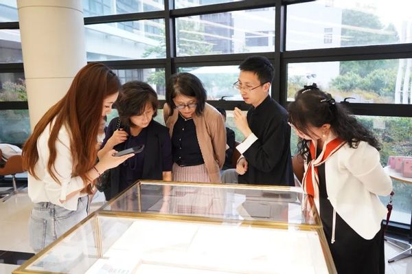 图书馆特藏建设中心馆员丁嘉晖与学术型研究生第一党支部副书记张韩为师生们讲解手稿