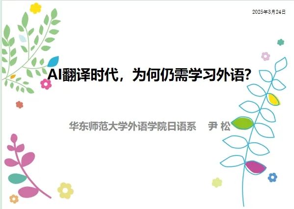 3月24日晚,“语”见未来——“全球视野下的外语学习与文化探索”系列讲座2025年第二讲在腾讯会议上如期开讲。日语系尹松教授应邀围绕“AI翻译时代,为何仍需学习外语?”展开讲演。来自全国各地的中学生及北京大学、上海交通大学、中国人民大学、中山大学、武汉大学、四川大学等高校师生210余人次在线聆听了本场讲座。讲座由华东师大比基尼 人才培养办公室主任赵宁主持。