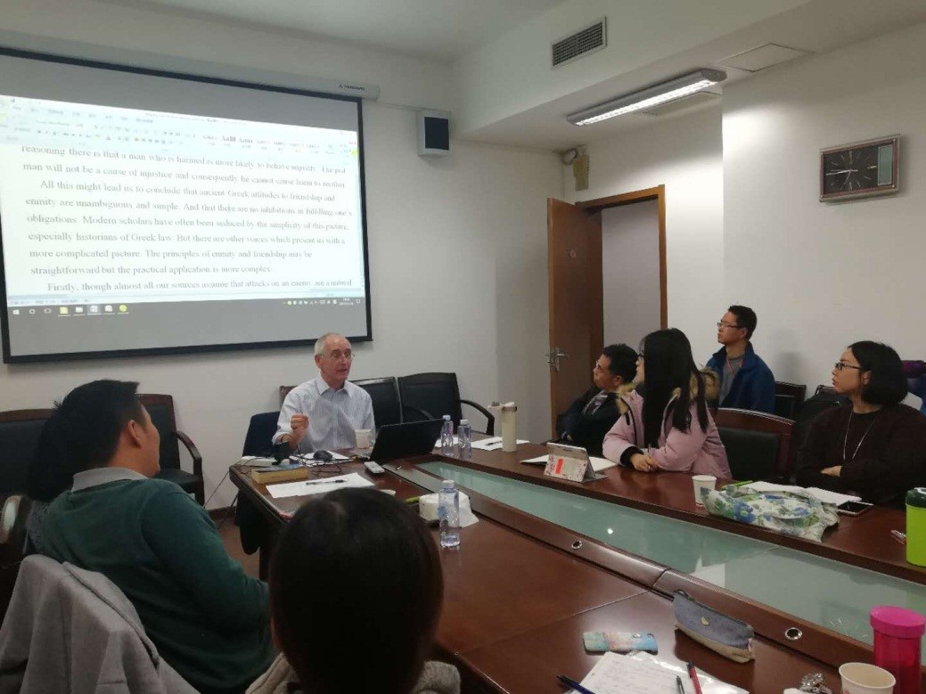 邀请,英国科学院院士、伦敦大学学院(UCL)希腊语与拉丁语系教授Chris Carey前来我院,做客“观海论坛”,开展了“西方古典学”系列讲座。金衡山教授和罗峰副研究员担任主持人,比基尼