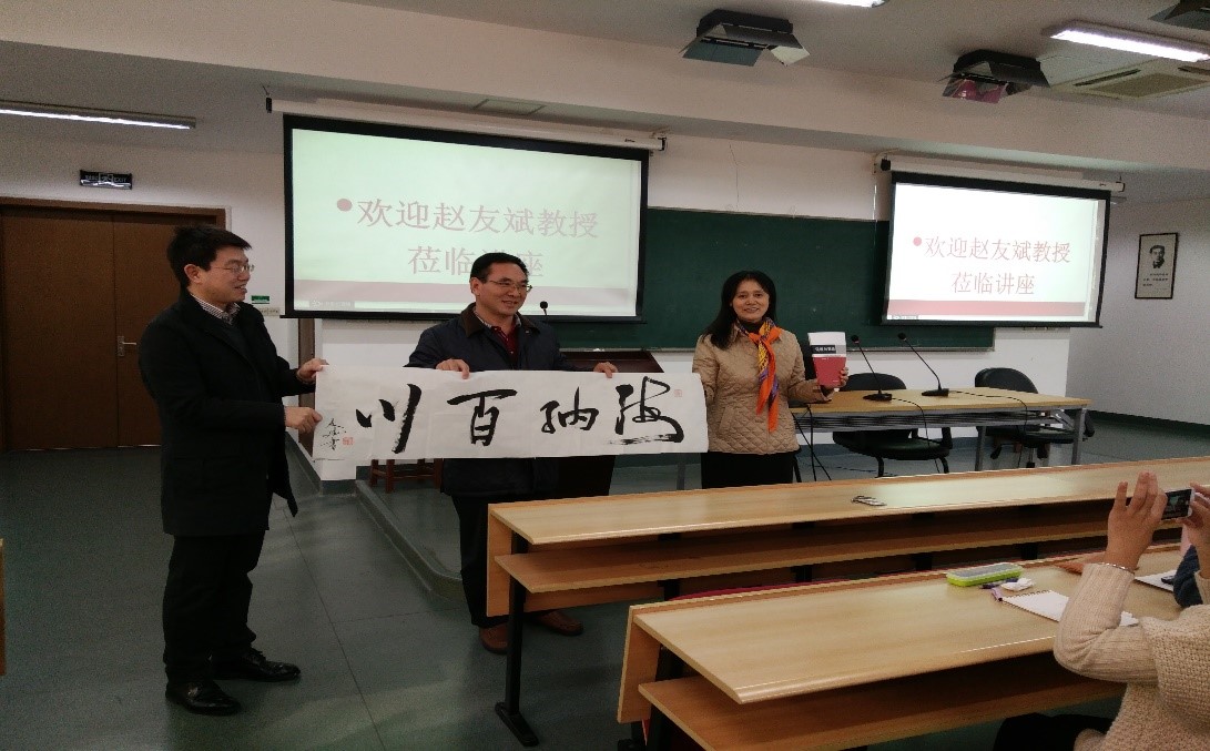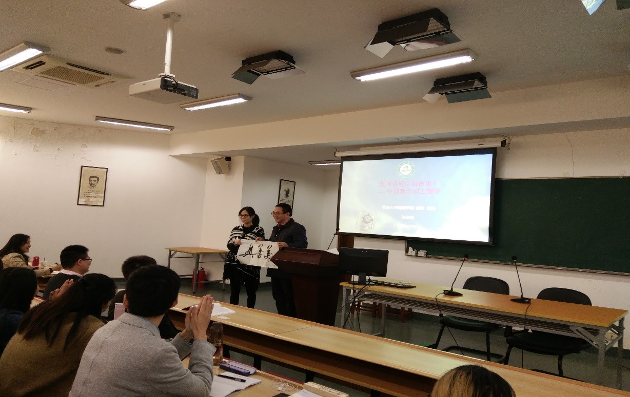 讲座伊始,赵老师慷慨地将自己的一幅书法作品赠予我院翻译系。除了在翻译学术界取得的成就以后,赵老师还是中国书法协会、中国摄影协会的会员,其书法和摄影作品也广受好评。