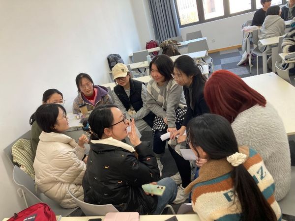 同学们在石冈洋子老师的组织下被分为三组,围绕“我的2023年度汉字”一题展开讨论。每位同学都在回顾今年一年的历程后,选择并写下了自己的年度汉字。随后,大家轮流在小组内面向其他同学介绍了自己选择这个字的原因。有同学选择了“変”作为年度汉字,认为“变化”是自己2023年生活的主旋律,也有同学选择了“実”,认为这一年中自己收获了许多成果,活动现场气氛十分热烈。