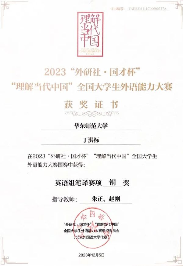 2023级翻译硕士丁洪标在众多参赛者中脱颖而出,荣获国家级铜奖。