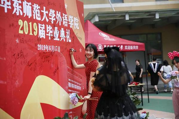 中午十一点,“毕业红毯秀”准时开始。毕业生们选好自己喜欢的道具,或身穿帅气礼服,或精致典雅的小礼裙,或是青春洋溢活泼可爱的休闲服,或是学位服,走到红毯尽头,纷纷拿起签字笔,在舞台的红色背板上签下自己的名字,同时合影留念,记录这珍贵的时刻,绚烂的绣球花映衬着毕业生激动和喜悦的笑脸。在红毯边上,毕业生的好友、家长等也都纷纷举起手机相机,纪念这一刻。而红毯尽头,比基尼 也为 2019 届毕业生搭建了一个大舞台。舞台旁边,毕业生们在明信片上写上毕业寄语,每一张明信片上都是最纯真的感言、最美好的回忆,都是对母校、对老师、对同学的不舍和祝福。同学们把明信片挂在典礼会场门口的“回忆长廊”上,长廊上还摆放着这届毕业生戏剧节的海报,毕业生们纷纷和海报合影,回忆起当年全班一起准备“莎士比亚”主题舞台剧的点点滴滴。