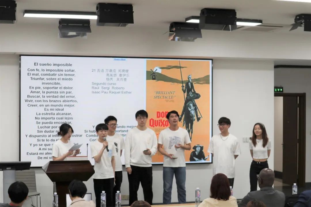 随后的学生风采展示环节由西语专业四个年级的本科学生共同呈现。既有激昂的阿根廷探戈名曲《一步之遥》,也有充满哲思的小组唱《不可能的梦》(选自音乐剧《我,堂吉诃德》)和悠扬的吉他弹唱《我的唯一》;诗歌朗诵环节采用了中西呼应的方式,既有智利诗人聂鲁达的《马丘比丘之巅》,也有北宋文学家苏轼的《水调歌头》和《念奴娇·赤壁怀古》的西班牙语译文朗诵;2022级学生带来《咱们裸熊》的配音片段、2020级同学则再现了《玩具总动员》的经典片段;演出在期待着中古友谊长存的《同一颗太阳》的歌声中落下帷幕。